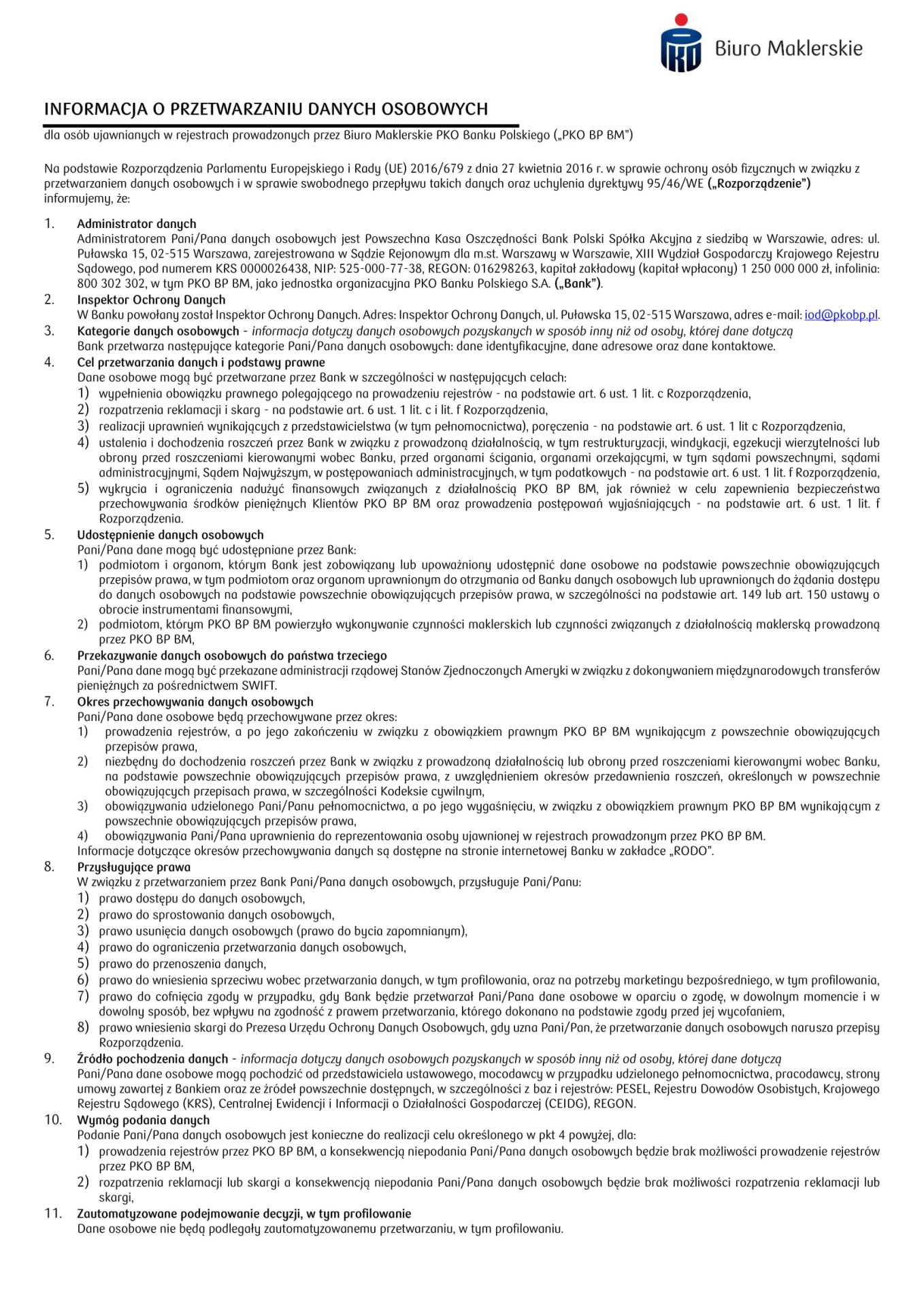 PKO PB informacja o przetwarzaniu danych osobowych